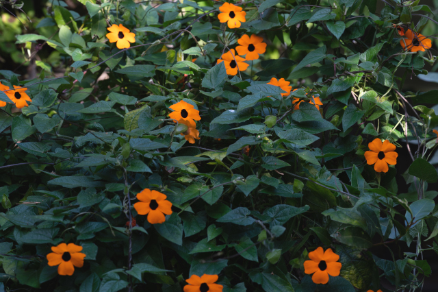 Bei der schwarzäugigen Susanne, Thunbergia alata, handelt es sich um eine sogenannte Himmelsblume, eine kräftige Kletterpflanze, die förmlich in den Himmel wächst. Benannt wurde sie nach dem schwedischen Botaniker Carl Peter Thunberg. Ihren deutschen Namen erhielt die aus Südostafrika stammende Pflanze aufgrund ihrer auffälligen Blüten, deren dunkle Mitte an ein Auge erinnert. Sie ist sehr blühfreudig, ihre lange Blütezeit erstreckt sich von Mai bis weit in den Oktober hinein. Da die Pflanze bei uns leider nicht winterhart ist, stirbt sie meist nach dem ersten Frost ab und wird nur einjährig gezogen. Ihre farbenfrohen Blüten stellen im Sommer eine wichtige Nahrungsquelle für Insekten wie Schmetterlinge und Hummeln dar, die durch ihre längeren Rüssel den Nektar am Blütengrund erreichen.